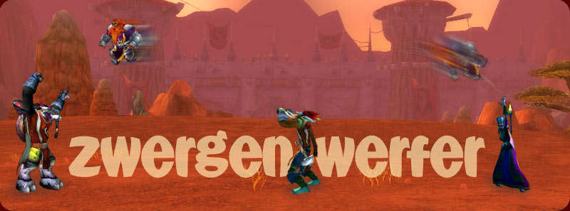 Den Zwerg... hebt an! Den Zwerg... werft!Zwergenwerfer heißt unsere Gilde auf dem World-of-Warcraft-Server Die Silberne Hand.* Wir betrachten das Zwergenwerfen vor allem als Ausgleichssport zu den vielen Abenteuern. Zwergenwerfer sind keine Rassisten und werfen “Zwerge” jeglicher Couleur, sobald sie der Allianz angehören - Mini-Zwerge, dicke Zwerge, große Zwerge und auch die Zwerge mit den doofen Ohren und die Zwerge mit den doofen Füßen. Wir spielen auf einem Rollenspiel-Server, auf dem Spieler-gegen-Spieler-Kämpfe (PvP) nur stattfinden, wenn der Spieler das ausdrücklich ermöglicht. Es muss sich also kein Zwerg und auch kein anderer Allianzler vor uns fürchten, denn wir können ihnen nichts zuleide tun, es sei denn, sie verhalten sich feindselig. Zu Beginn haben wir jedem die Möglichkeit gegeben, uns anzugreifen. Mit der Zeit hat sich das gewandelt, heute kämpfen wir gegen andere Spieler eher auf den dafür vorgesehenen Schlachtfeldern. Wenn wir nicht gerade Abenteuer oder Zwerge suchen, werden bei Disteltee und Spinnenwurst die Auftragsbücher verglichen oder die Fischbestände von Booty Bay ausgedünnt. Oder man trifft sich für ein gemütliches Pläuschchen am Lagerfeuer, oder um gemeinsame Entdeckungsreisen in entlegene Gebiete zu unternehmen. Sogar Stormwind und Ironforge wurden schon von Zwergenwerfern besucht, wie man hier sieht. Ab und zu machen wir mal was größeres, verhauen den Baron in 45 Minuten, gehen zu drei Hexern, einem Priester und einem Magier in den Tiefensumpf, oder mit 10 Tauren nach Karazhan. Alle drei Ausflüge ausgesprochen erfolgreich. Die Zwergenwerfer haben nur diese Website und kein Forum, weil die Gilde klein genug ist, alles anfallende direkt im Spiel zu klären. Wir haben auch keinen Gildenkodex. Gesunder Tauren-/Troll-/etc.-Verstand ist schließlich auch was feines. Viele von uns sind im RPakt und wir kennen uns mittlerweile fast alle persönlich, teilweise besser, als einem manchmal lieb ist :) Bei uns kann man sich deswegen auch nicht bewerben wie in manchen anderen Gilden, sondern: mit uns kann man sich anfreunden. Und wenn wir dann merken, dass wir bei gemeinsamen Abenteuern dieselbe Einstellung, Spaß und Erfolg haben, kannst auch du ein Zwergenwerfer werden. Willst du in Kontakt mit uns treten, kannst du einen von uns ansprechen. Eine Übersicht über alle Zwergenwerfer findet sich hier. Nach fünfjährigem Bestehen haben auch einige Mitstreiter die Gilde wieder verlassen (hier ist eine Übersicht über diese Ex-Zwergenwerfer). Auf dem Server Todeswache sind von Ruut neue Zwergenwerfer gegründet worden: mehr Informationen über sie gibt es im Arsenal. Haftungsausschluss • Design: Efemia • Kontakt: Manolete |